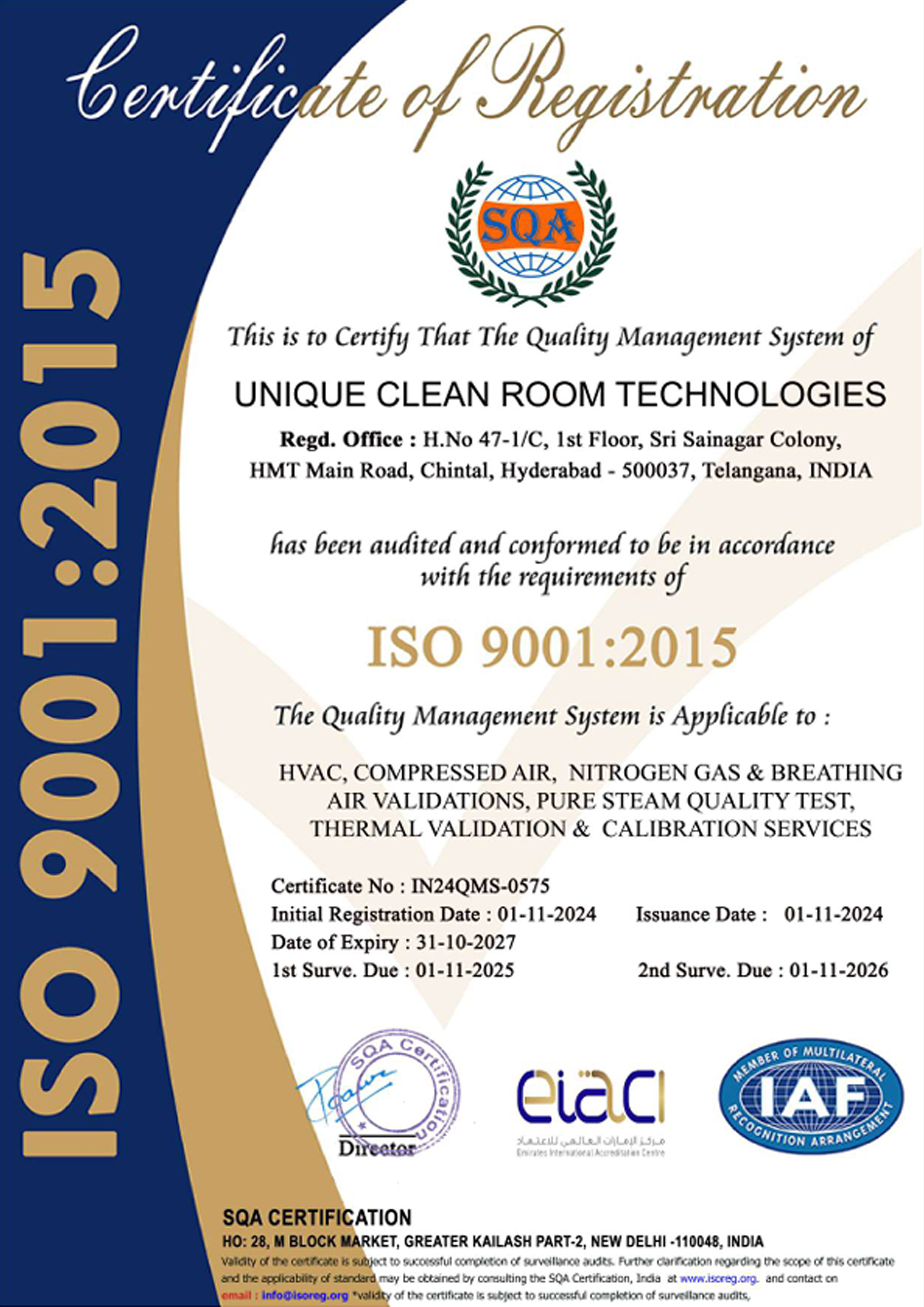 Unique Cleanroom Technologies provides validation services to Pharmaceutical, Food, Biotech and other Microelectronic industries regulated standards such as ISO-14644, ISO-8573, EU-GMP, WHO, USFDA. Unique Cleanroom Technologies is a Pan India Company with the most competitive focus in the field of Validation of Cleanroom / I-1VAC activities. Established in 2014, We have the capability to offer our customers localized support and services when and wherever required. We have been certified by ISO.